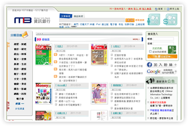 MIB信息银行于2008 年初上线营运,为数位出版品付费阅读平台。数位时代来临,因特网网络逐渐改变人们的生活形态与习惯,连阅读也不例外。在这个出版品爆炸且多元的时代,MIB信息银行突破纸本出版与发行的时空限制,让逐渐消失的内容能重新典藏利用,以崭新的面貌加值再现。